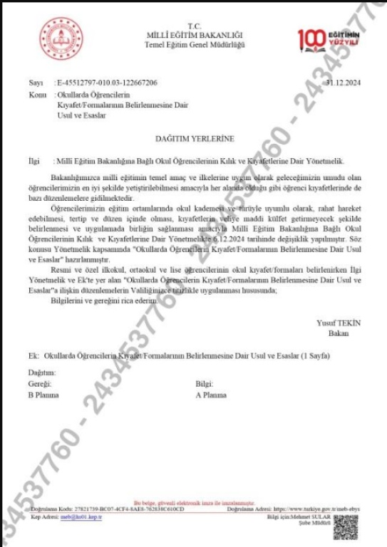"Millî Eğitim Bakanlığına Bağlı Okul Öğrencilerinin Kılık ve Kıyafetlerine Dair Yönetmelikte Değişiklik Yapılması Hakkında Yönetmelik" MADDE 3 – (Değişik:RG-6/12/2024-32744-C.K.-9216/3 md.)
