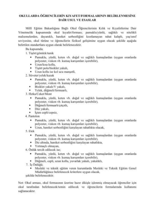 Milli Eğitim Bakanlığına Bağlı Okul Öğrencilerinin Kılık ve Kıyafetlerine Dair Yönetmelik uyarınca, 2025-2026 Eğitim Öğretim Yılında öğrenci okul kıyafetinde değişikliğe gidilmeyecek olup halihazırda kullanılmakta olan okul kıyafeti kullanılacaktır.